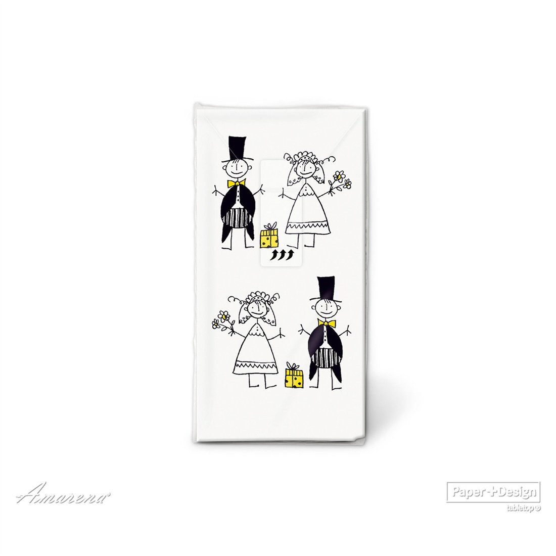 Svatba, papírové kapesníky, 10 ks za balení. S tiskem postav ženicha a nevěsty. Znovu uzavíratelné obaly. Bez chloru, hypoalergenní a šetrné k životnímu prostředí.