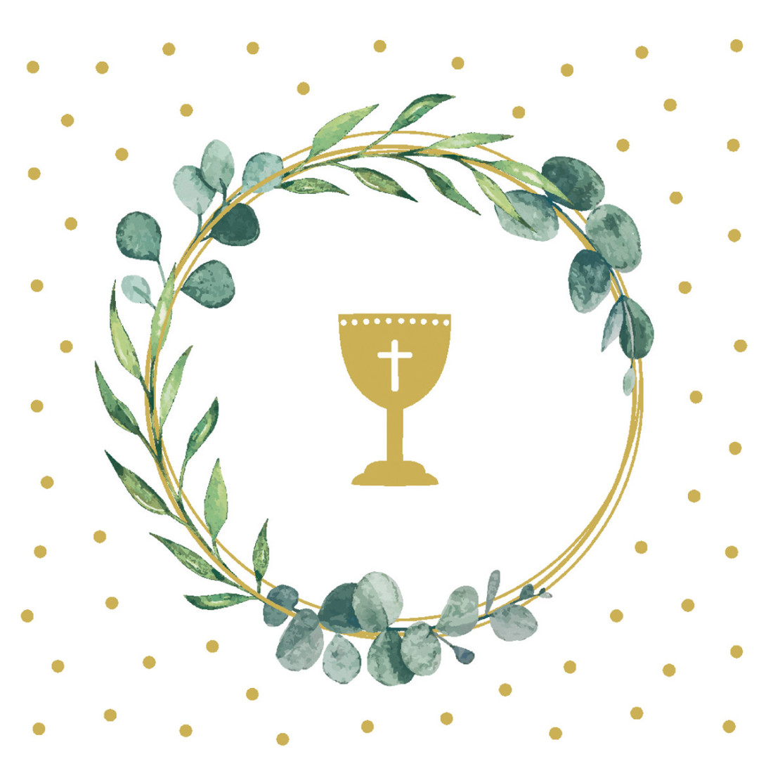 Slavnostní ubrousky z netkané textilie vhodné při příležitosti prvního svatého přijímání, biřmovky nebo konfirmace. Tyto bílé ubrousky jsou zdobeny zeleným eukalyptem a zlatým kalichem, jsou výbornou volbou pokud připravujete prostírání při oslavě např. biřmovky, či prvního svatého přijímání. Netkaná textilie je materiál napodobující látku, hedvábně hebký na pohled i dotek. Podívejte se i naše další druhy ubrousků na konfirmaci, birmovku, či první svaté přijímání.