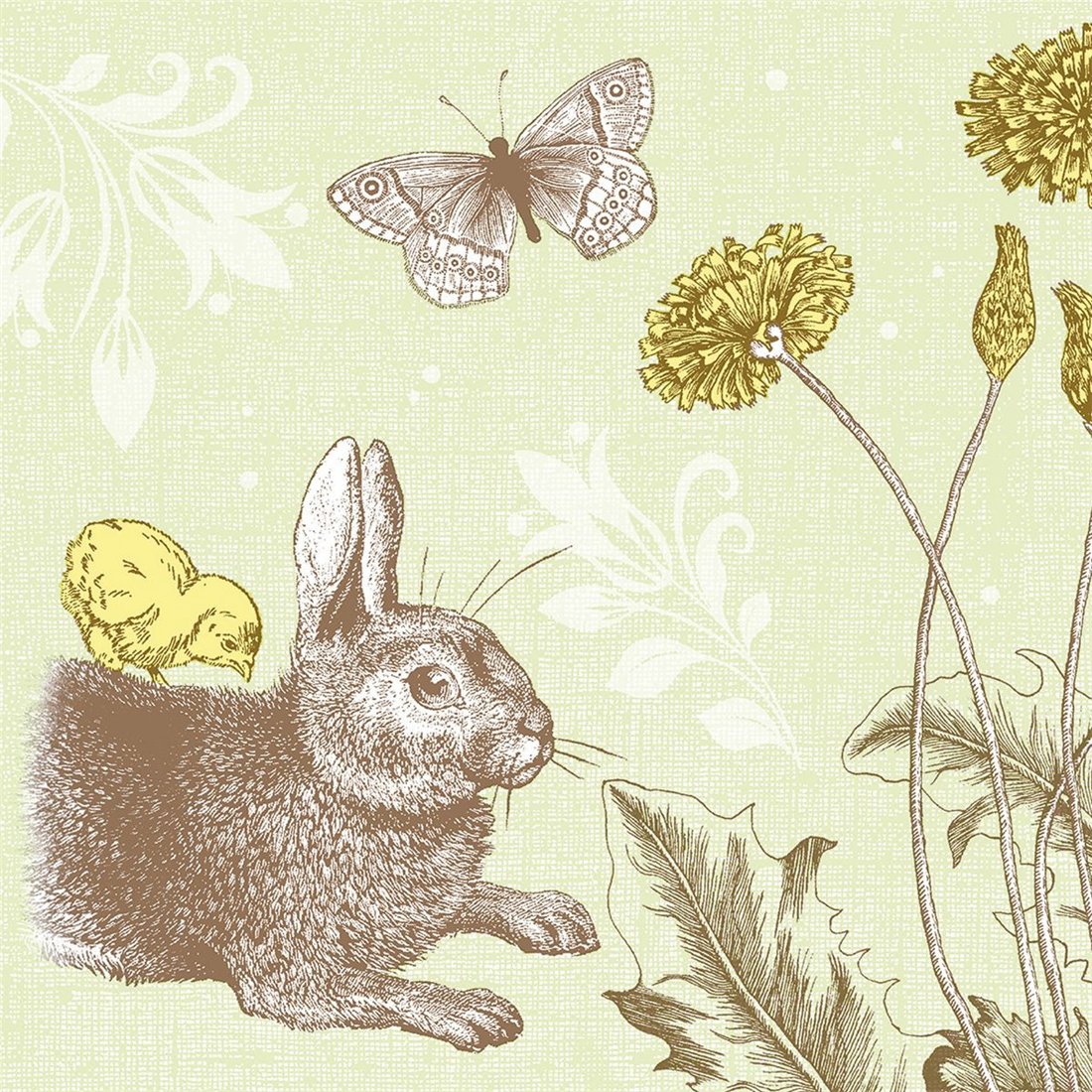 Velikonoční ubrousky Peter ve svěží zelené barvě s roztomilým hnědým zajíčkem jsou dokonalým doplňkem na sváteční stůl. Jemný jarní odstín zeleně symbolizuje nový začátek a probouzející se přírodu, zatímco milý motiv zajíčka dodává prostírání hravý a zároveň elegantní nádech. Ubrousky jsou vyrobeny z kvalitního materiálu /netkané textilie/, který je příjemný na dotek, dobře saje a drží tvar během celého stolování. Ideální pro velikonoční oběd, rodinná setkání, jarní oslavy či tematické dekorování interiéru.